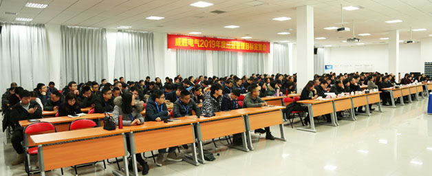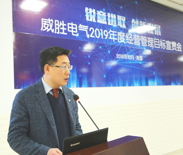 歲序更新催奮進,瑞雪霏霏兆豐年!2018年12月30日上午,以“銳意進取,創(chuàng)新發(fā)展”為主題的威勝電氣2019年經(jīng)營管理目標宣貫會在電氣產(chǎn)業(yè)園會議中心培訓室順利召開。控股董事會吉為主席、控股本部、威勝電氣董事會以及經(jīng)營管理團隊的各位領導、威勝電氣員工代表共計300余人參加了本次會議,會議由威勝電氣行政人事總監(jiān)鄧超艷女士主持。