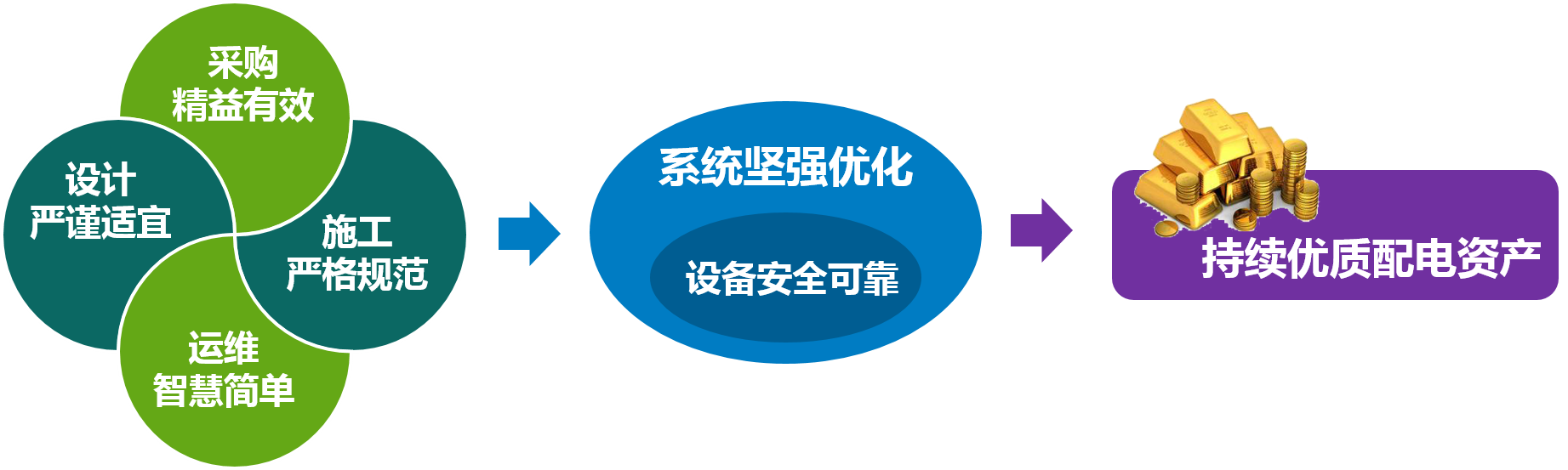 我們通過嚴謹適宜的設計、精益有效的采購、嚴格規范的施工和智慧簡單的運維,建設并運營一個由安全可靠的智能設備組成的堅強優化的配用電系統,向業主提交一套持續優質的配電資產。