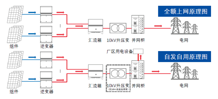 自發自用、余電上網模式:采用380V電壓等級接入時,單并網點容量≤所接配變額定容量50%;采用10kV電壓等級接入時,單并網點容量受光伏專用升壓變額定容量限制;電站接入點為用戶現有配電系統。