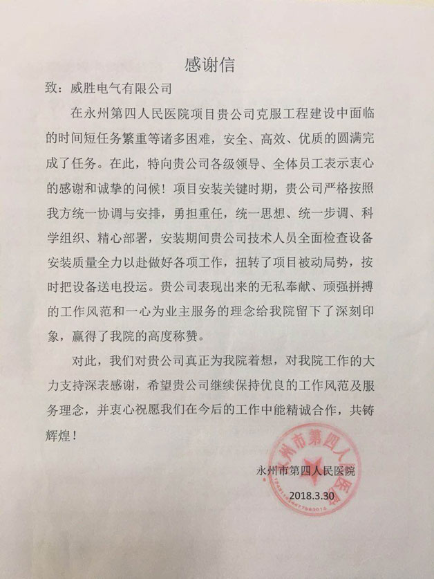 近日,威勝電氣收到了永州市第四人民醫院發來的表揚信,感謝我公司的優質服務。