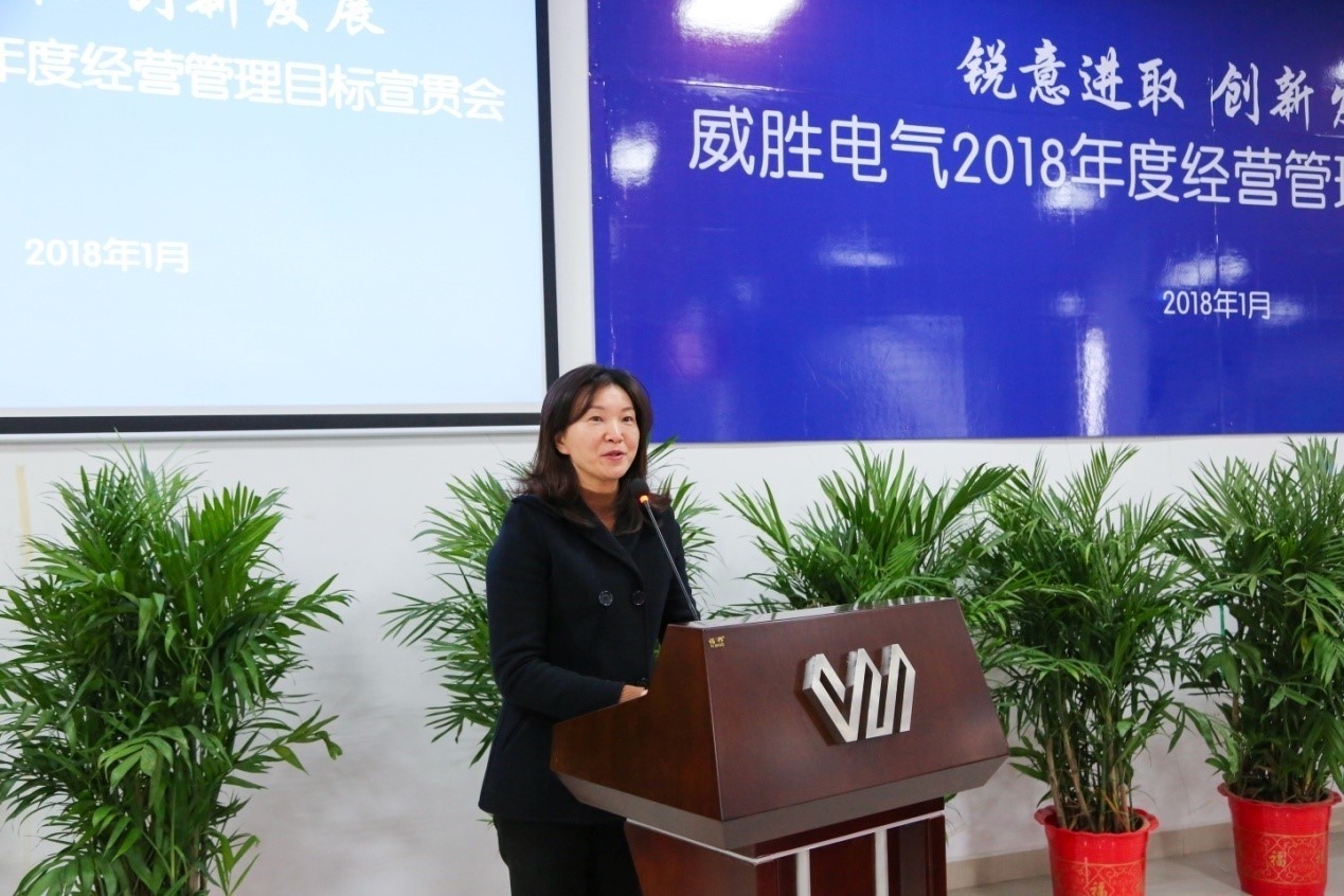 2018年1月8日下午,以“銳意進取,創新發展”為主題的威勝電氣2018年經營管理目標宣貫會在電氣產業園會議中心培訓室順利召開。控股董事會吉主席、控股本部、威勝電氣董事會以及經營管理團隊的各位領導、威勝電氣員工代表共計260余人參加了本次會議,會議由威勝電氣行政人事總監鄧超艷女士主持。