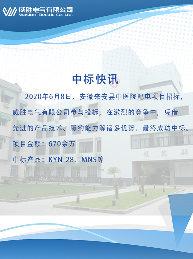 2020年6月8日,安徽來安縣中醫(yī)院配電項目招標,威勝電氣有限公司參與投標,在激烈的競爭中,憑借先進的產品技術、履約能力等諸多優(yōu)勢,最終成功中標。