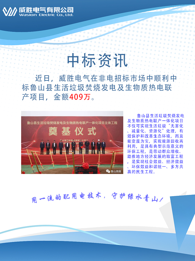 近日,威勝電氣在非電招標(biāo)市場(chǎng)中順利中標(biāo)魯山縣生活垃圾焚燒發(fā)電及生物質(zhì)熱電聯(lián)產(chǎn)項(xiàng)目,金額409萬。