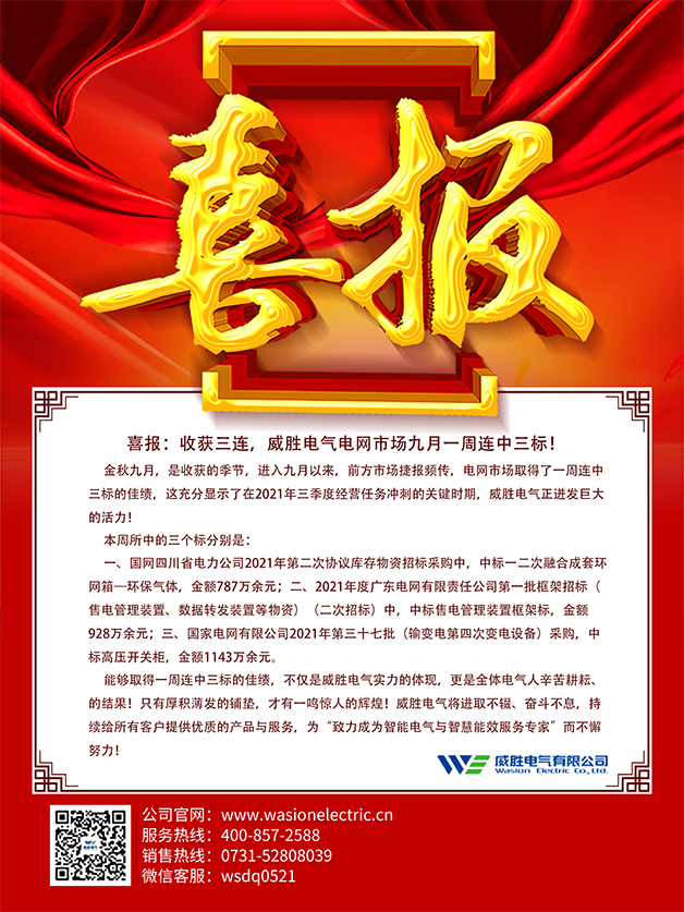 金秋九月,是收獲的季節(jié),進(jìn)入九月以來,前方市場捷報頻傳,電網(wǎng)市場取得了一周連中三標(biāo)的佳績,這充分顯示了在2021年三季度經(jīng)營任務(wù)沖刺的關(guān)鍵時期,威勝電氣正迸發(fā)巨大的活力!