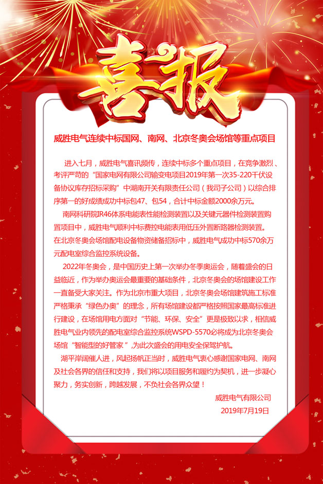 進(jìn)入七月,威勝電氣喜訊頻傳,連續(xù)中標(biāo)多個(gè)重點(diǎn)項(xiàng)目,在競爭激烈 、考評(píng)嚴(yán)苛的“國家電網(wǎng)有限公司輸變電項(xiàng)目2019年第一次35-220千伏設(shè)備協(xié)議庫存招標(biāo)采購”中湖南開關(guān)有限責(zé)任公司(我司子公司)以綜合排序第一的好成績成功中標(biāo)包47、包54,合計(jì)中標(biāo)金額2000余萬元。