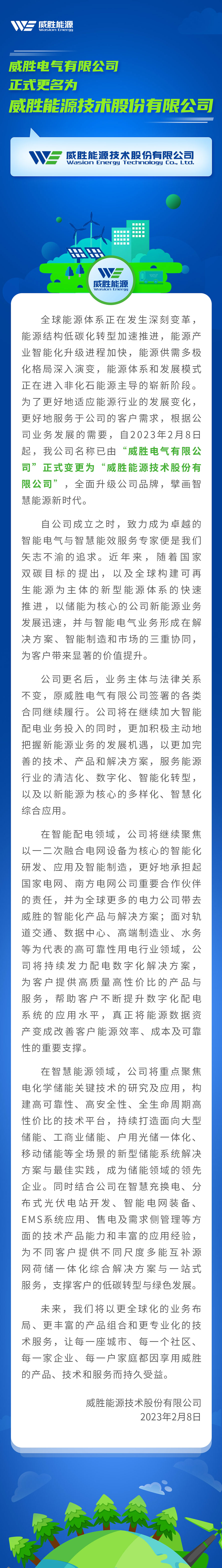 全球能源體系正在發(fā)生深刻變革,能源結(jié)構(gòu)低碳化轉(zhuǎn)型加速推進(jìn),能源產(chǎn)業(yè)智能化升級(jí)進(jìn)程加快,能源供需多極化格局深入演變,能源體系和發(fā)展模式正在進(jìn)入非化石能源主導(dǎo)的嶄新階段。為了更好地適應(yīng)能源行業(yè)的發(fā)展變化,更好地服務(wù)于公司的客戶需求,根據(jù)公司業(yè)務(wù)發(fā)展的需要,自2023年2月8日起,我公司名稱已由“威勝電氣有限公司”正式變更為“惟遠(yuǎn)能源技術(shù)股份有限公司”,全面升級(jí)公司品牌,擘畫智慧能源新時(shí)代。