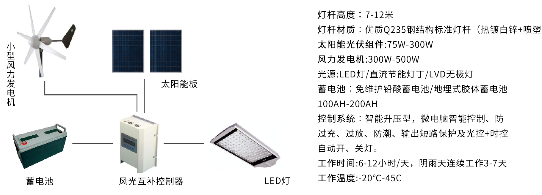 5、控制系統:控制系統,同時實現光效控制和時間控制,具備過充、過放、過載、欠壓、保護等智能控制功能。此外,低電壓升壓充電系統,在風力發電和太陽能發電電壓小于24V大于15V的情況下,對這部分電能升壓到24V以上以充分利用。