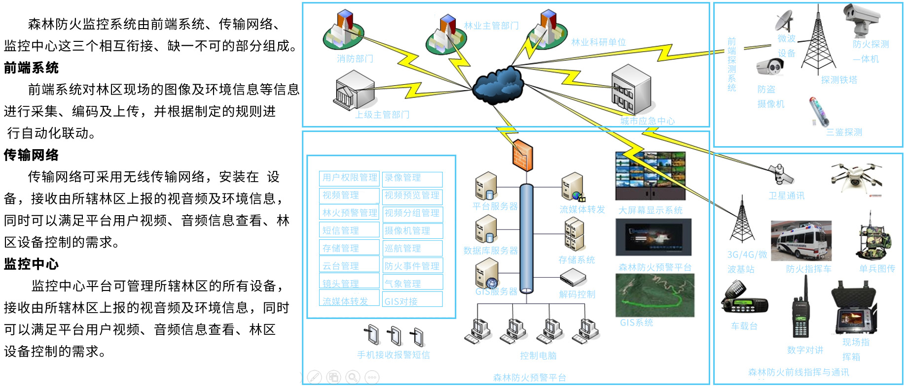 智慧森林防火監控系統,就是利用無縫融合的智能圖像識別技術、面向對象的3D GIS技術、大型網絡監控技術等高新技術,結合林業管理的專業知識和林業防火的經驗,實現林區視頻的自動監控、煙火準確識別、火點精確定位、火情蔓延趨勢推演、撲救指揮的輔助決策、災后評估等多方面功能,建立森林防火的完整業務鏈,并針對性地解決用戶的各種個性化需求,最終實現對林區的保護和可持續發展。